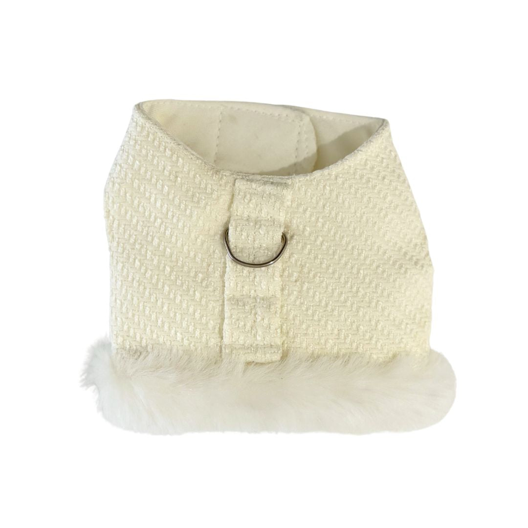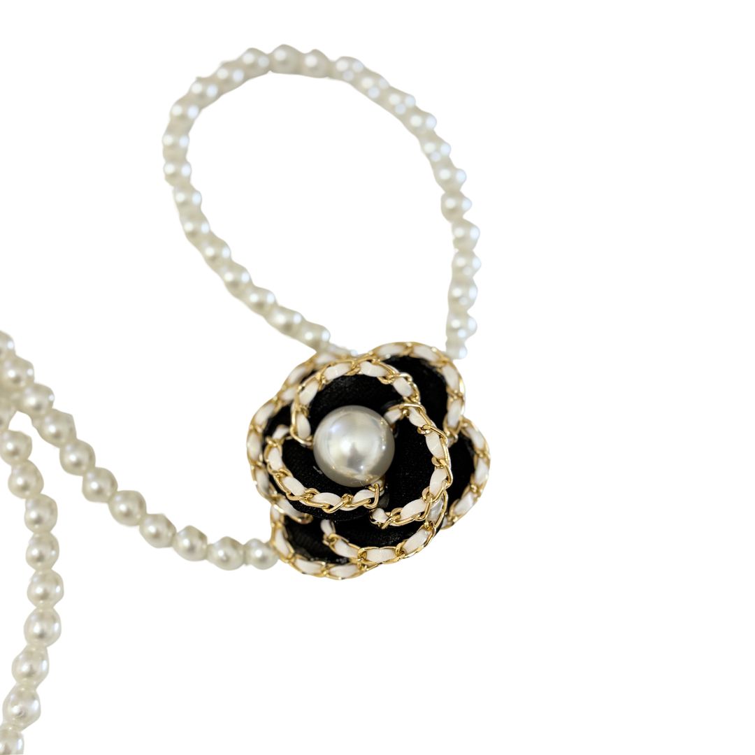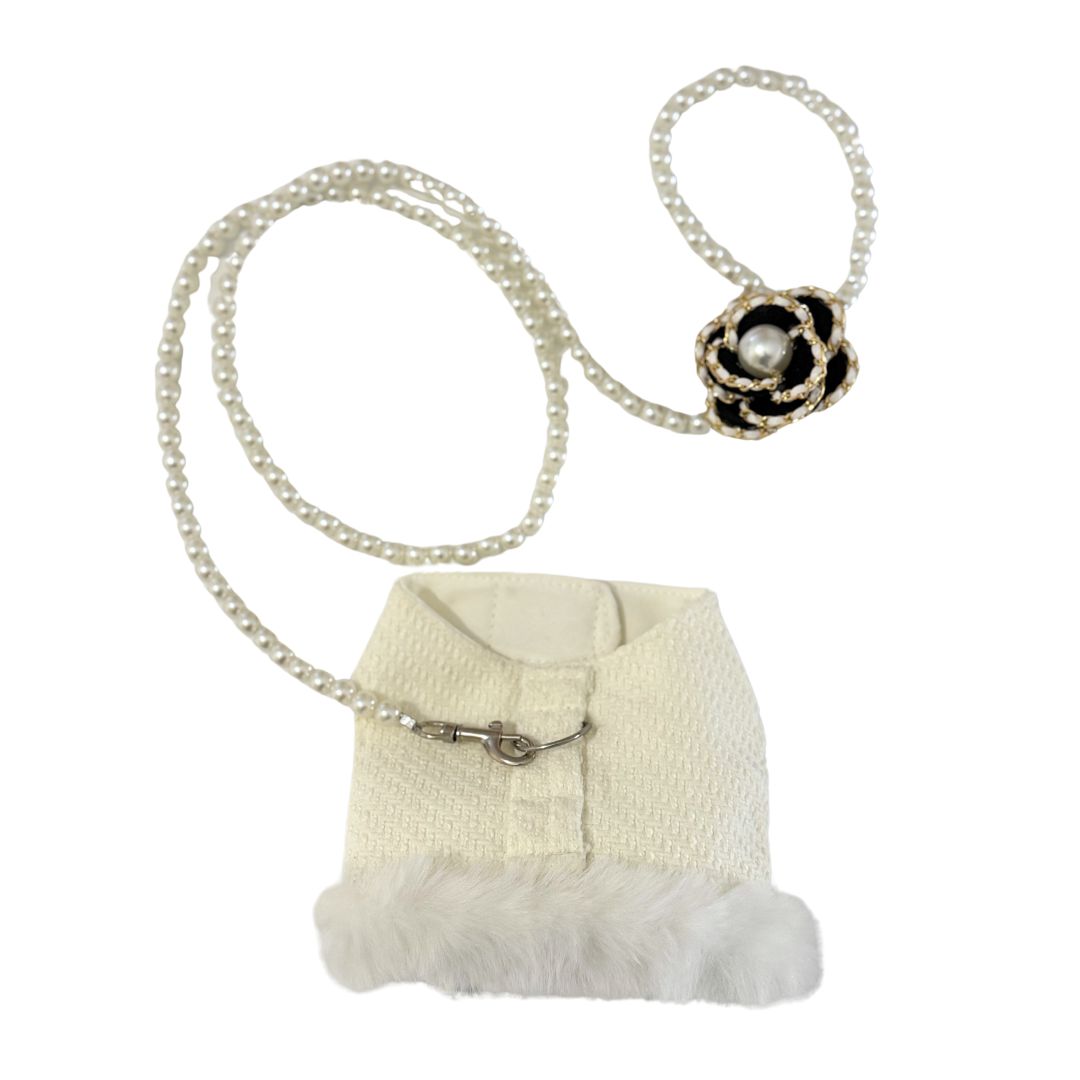 El glamour parisino aterriza en nuestra tienda con este ideal set de arnés ajustable tweed con correa de perlas y broche de camelia de alta calidad (puede ser usado como complemento para otros outfit o como traba de pelo)