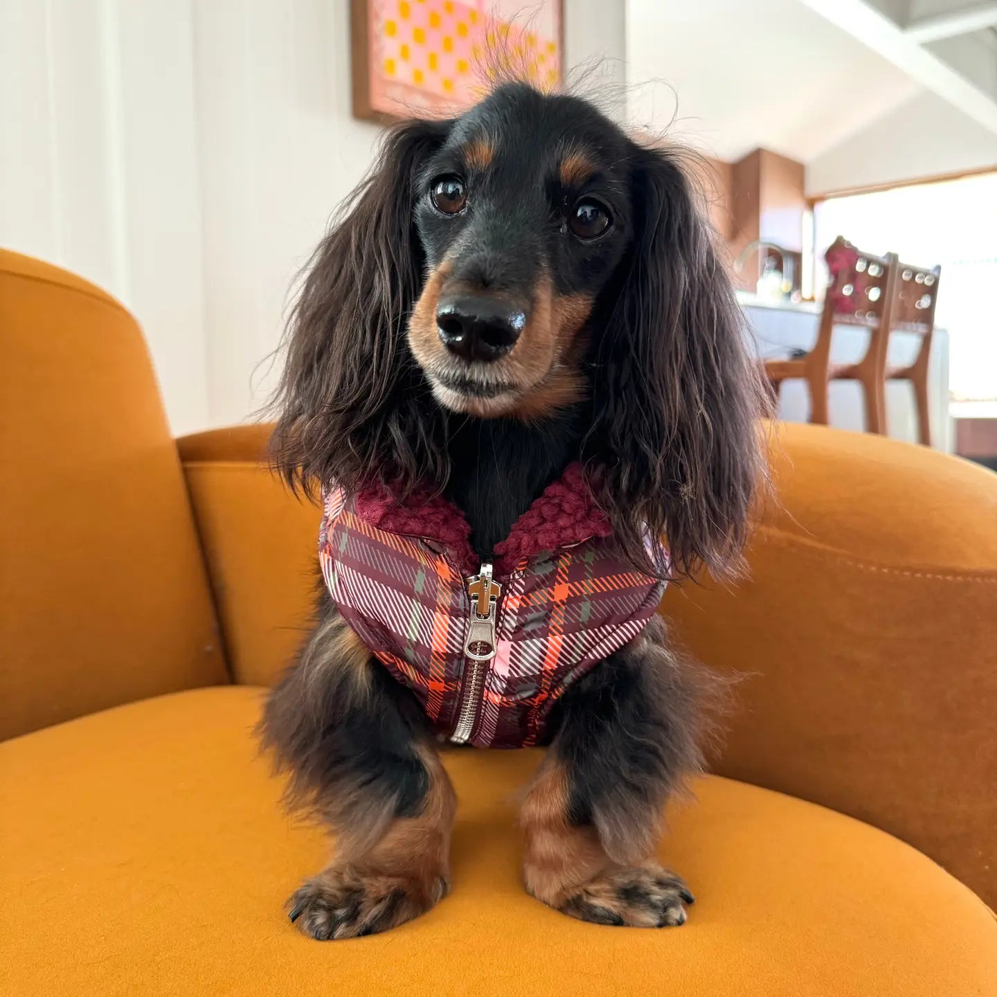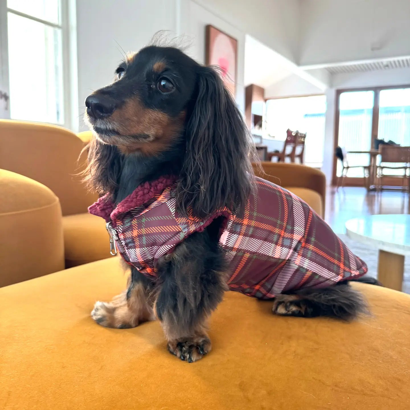 - Doble cara con estampado de cuadros y borreguito, con ojal para usar con arnés o collar.