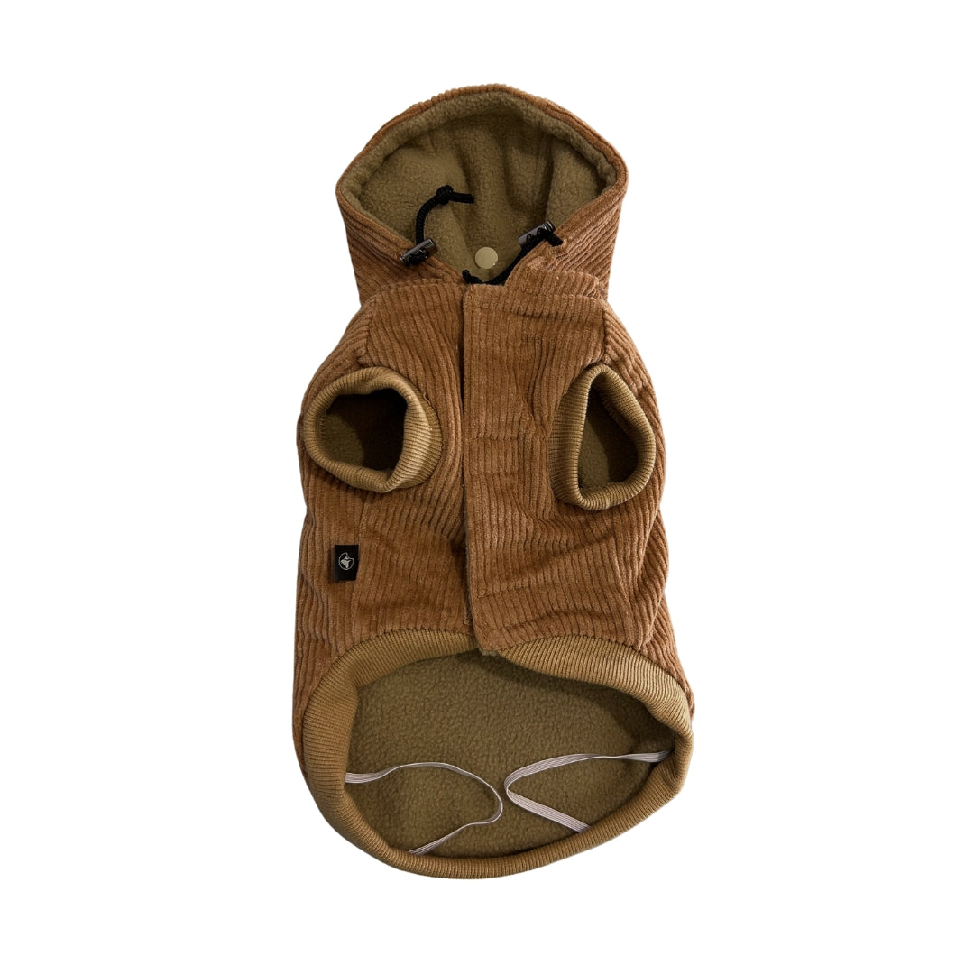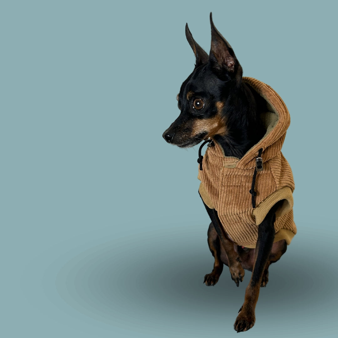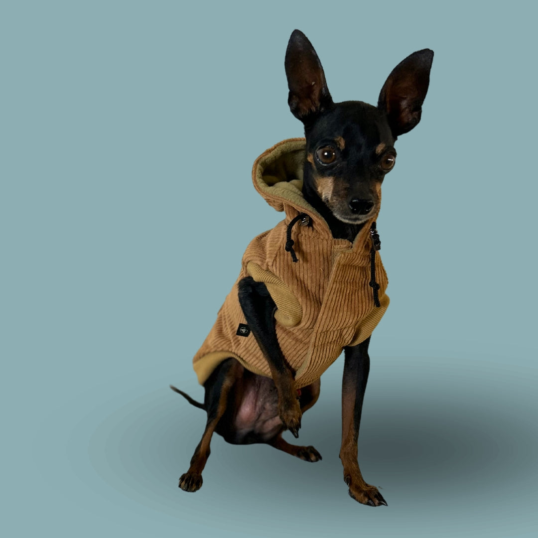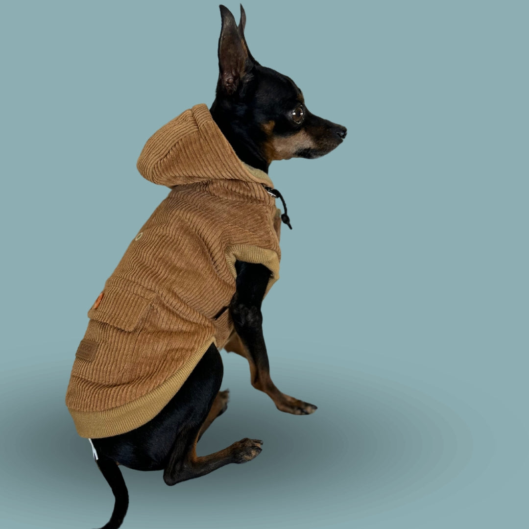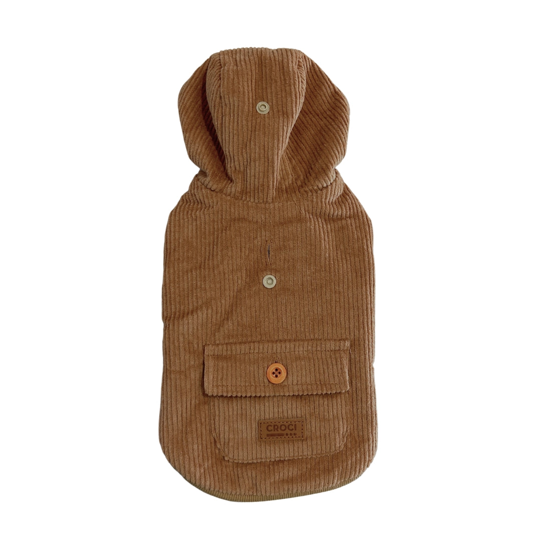 A para perro con capucha confeccionado en tela de terciopelo acanalado de color beige con mangas y un pequeño botón con capucha. Interior forro polar.