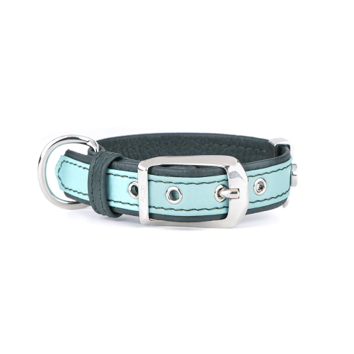 Collar fabricado en cuero italiano con acabados en bronce blanco. Cuenta con una anilla en "D" para facilitar el anclaje a la correa y un porta placas para colgar la chapa identificativa.