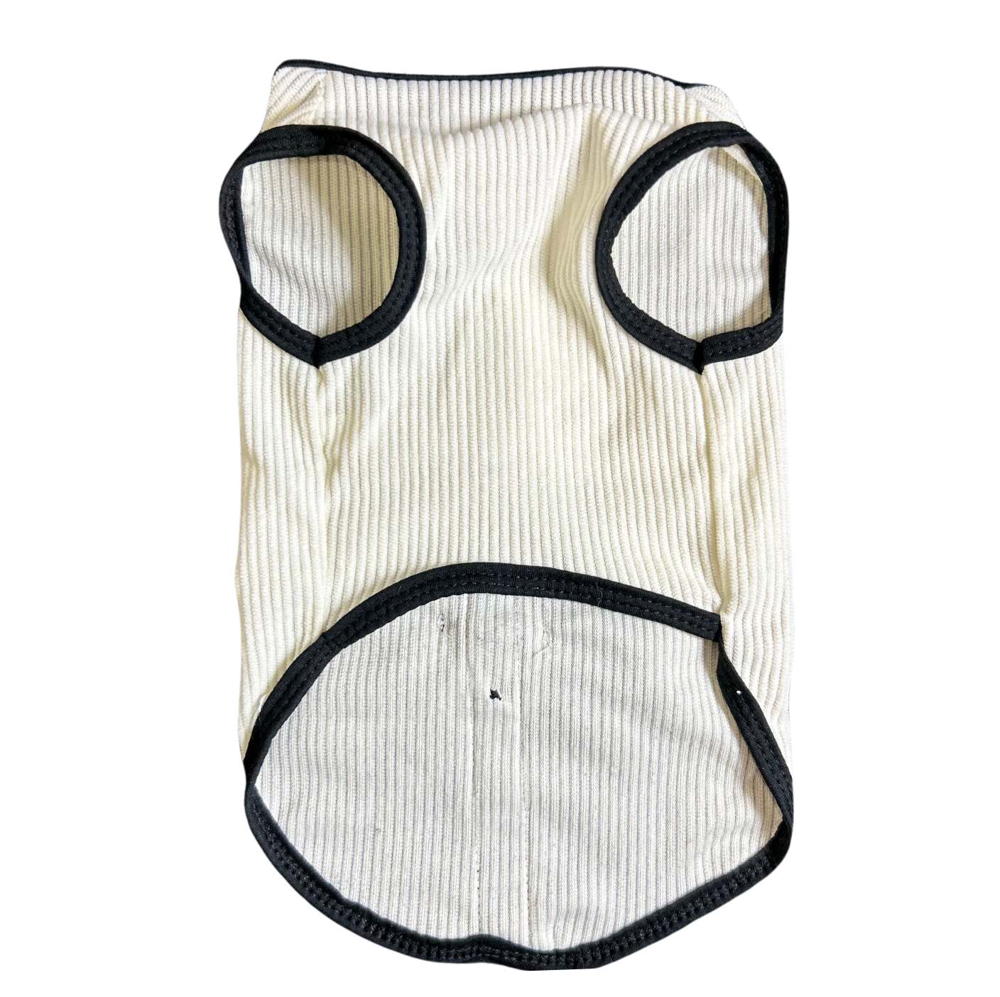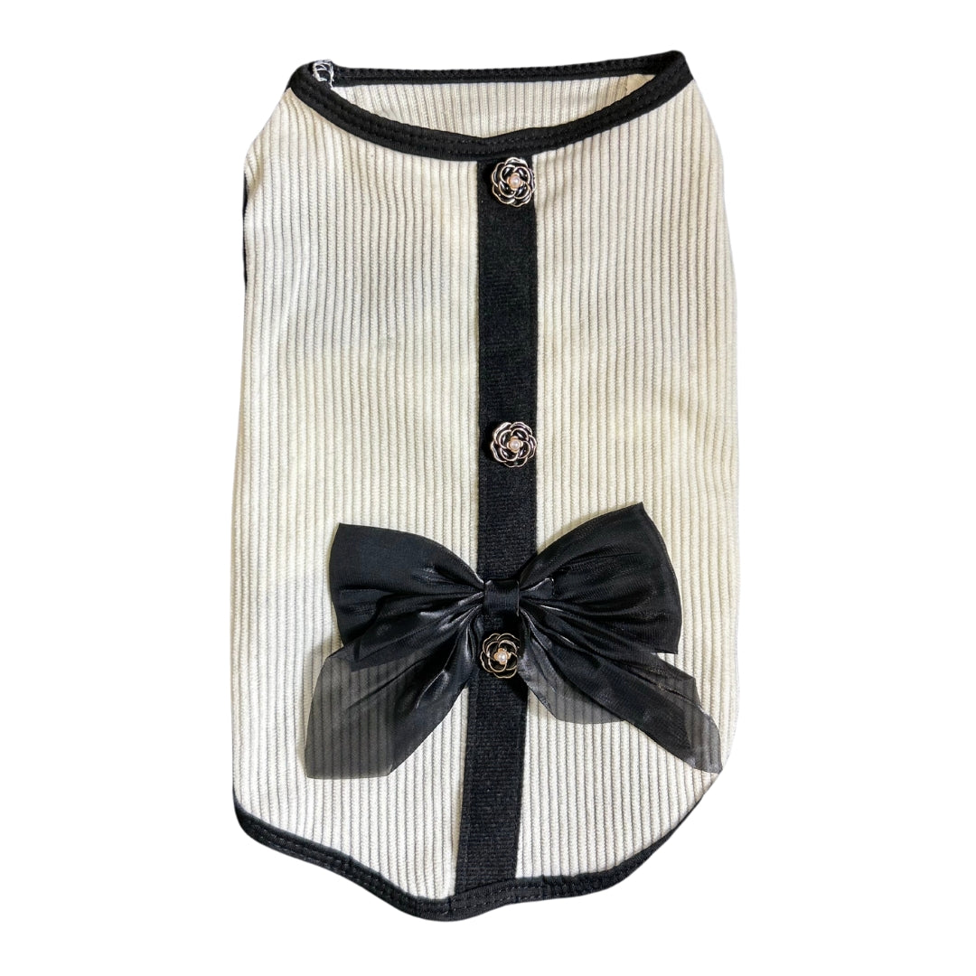 Jersey de suave tacto acanalado en color blanco crudo, con detalles en negro. Coronado con lazo y botones decorativos con camelia y perla.