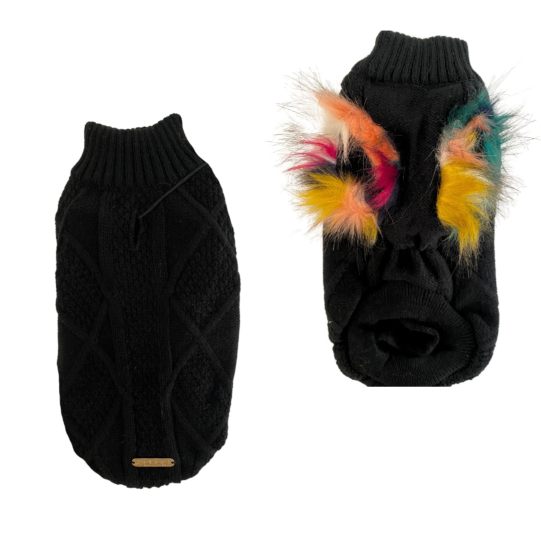 Exclusivo jersey trenzado negro, de diseño italiano con mangas delanteras de pelo sintético multicolor