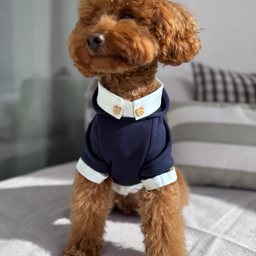 Sudadera Eddy en tono azul marino con detalle osito de peluche y ojal para usar con collar o arnés. La camisa se vende por separado.
