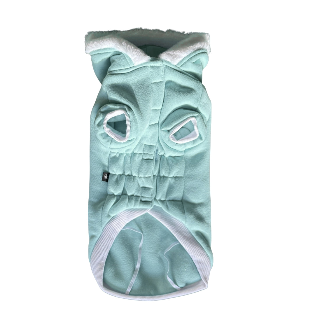 Cálida, cómoda y fácil de poner gracias a su cierre de velcro ajustable y bandas elásticas que se adaptan al cuerpo. Incluye orificio para enganchar la correa.