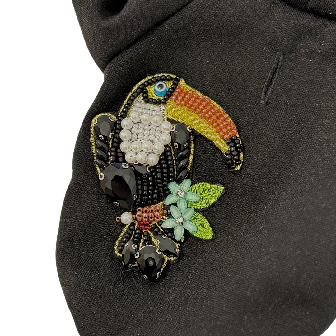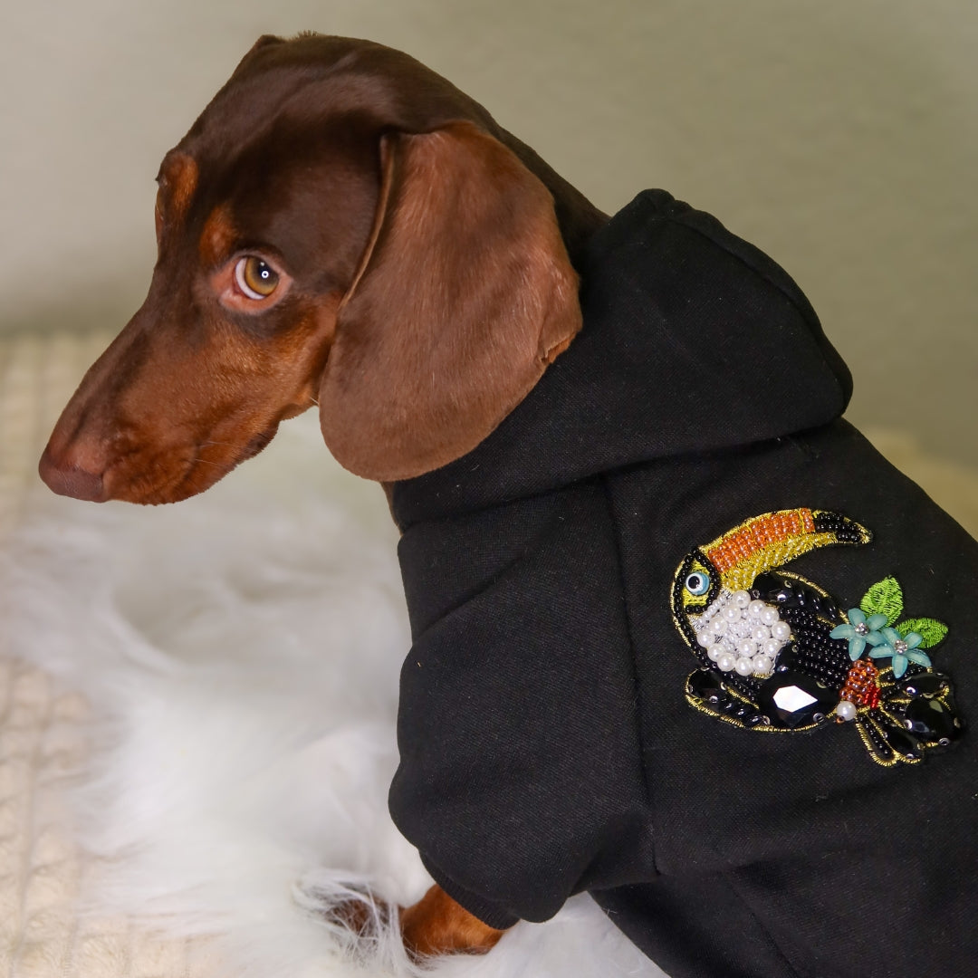 Espectacular sudadera con aplique tucán de perlas cosido a mano en España. Incluye ojal para usar con collar o arnés