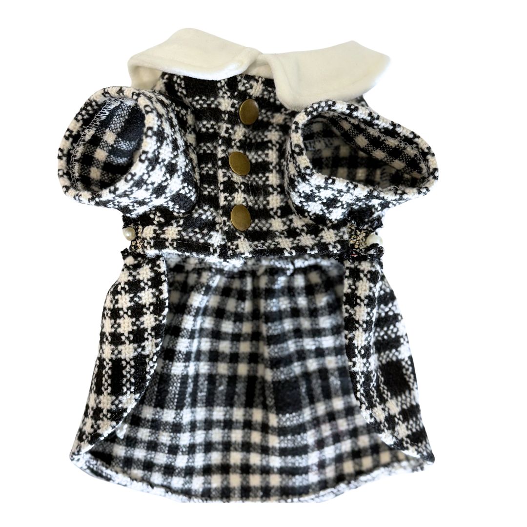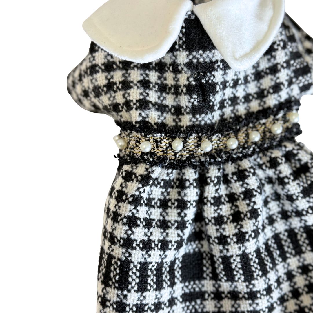 Ideal vestido en pata de gallo blanco y negro con cuello tipo babero y cinturón integrado tweed con perlas de imitación. Dispone de ojal para usar con arnés